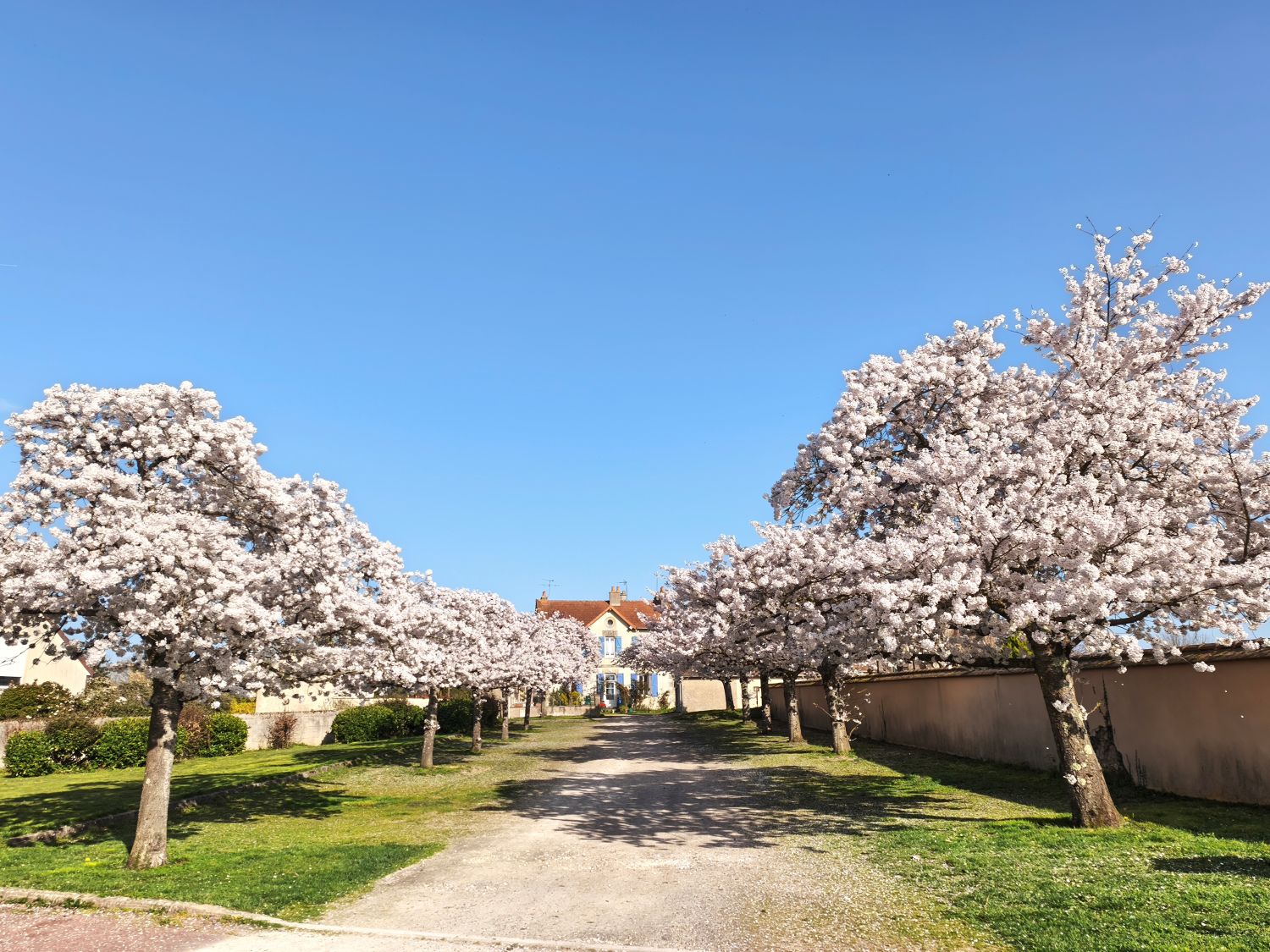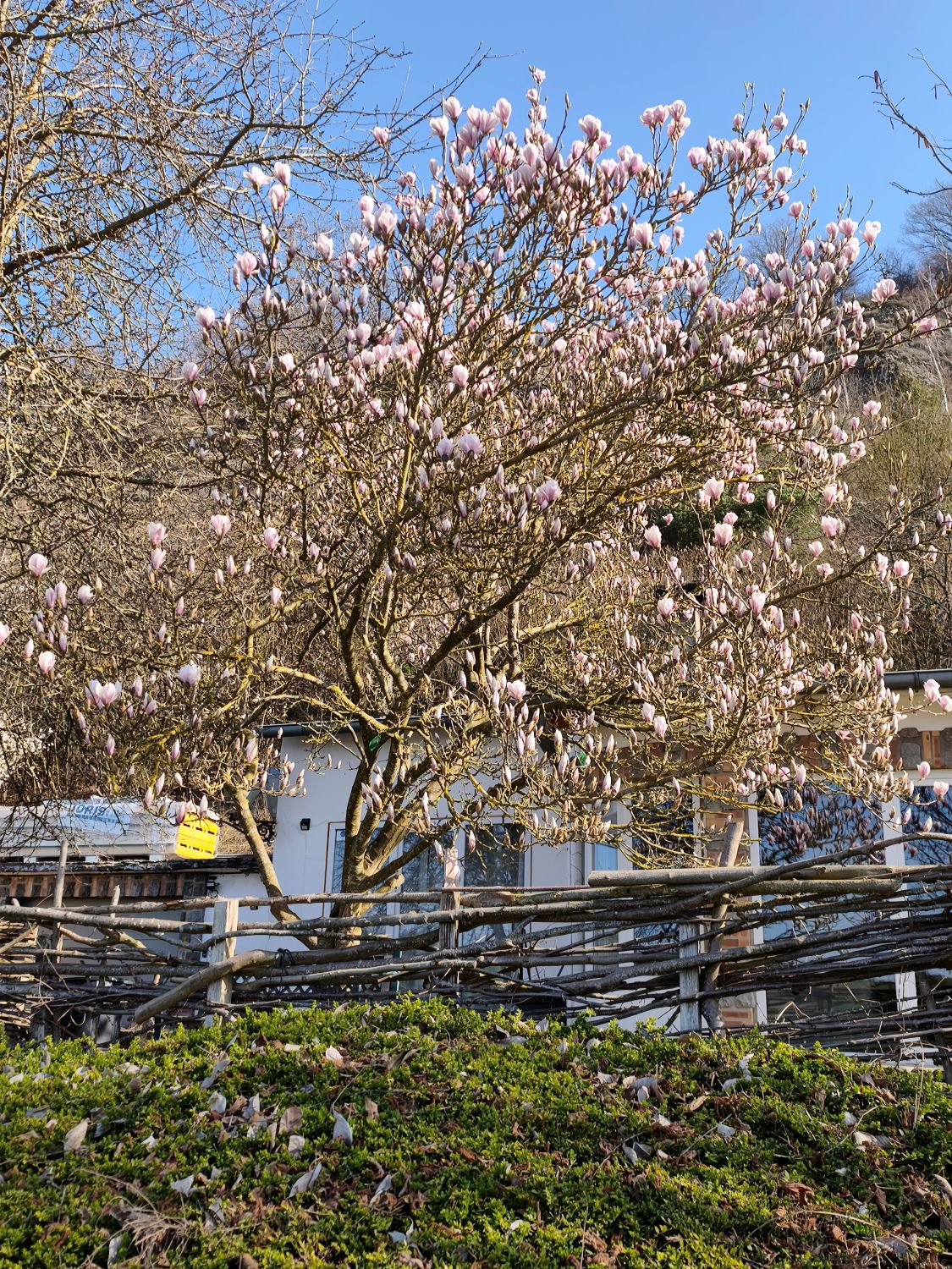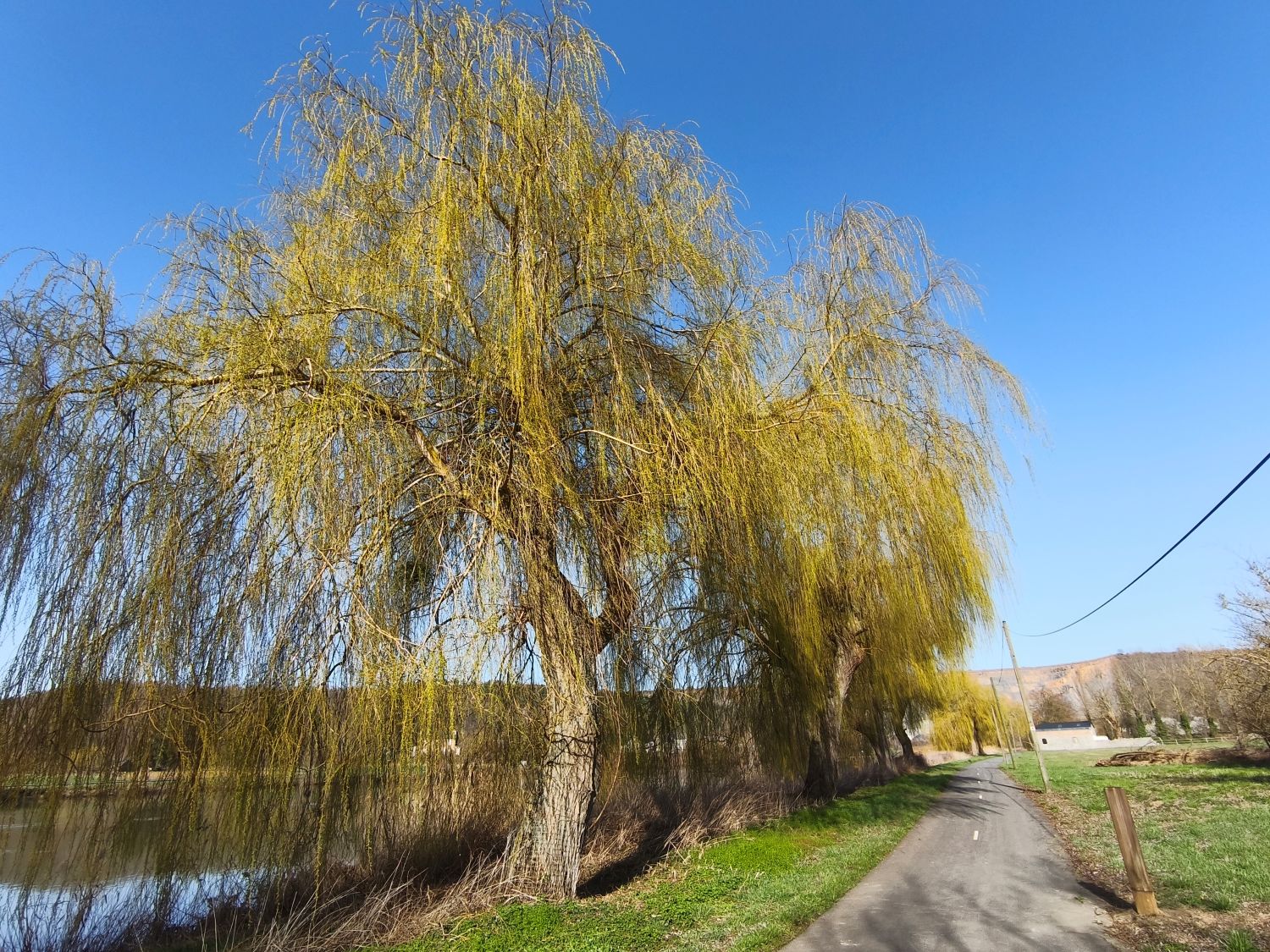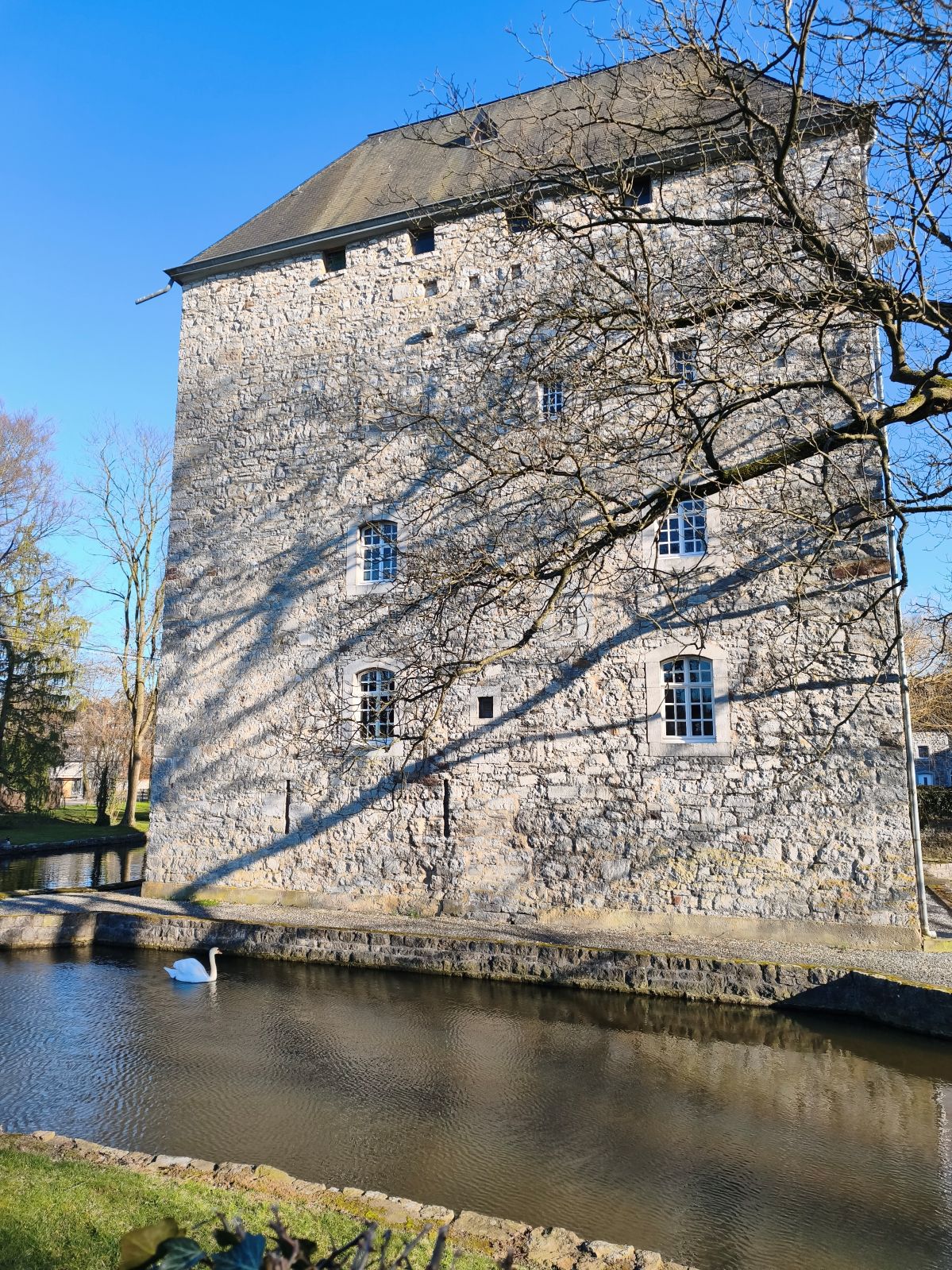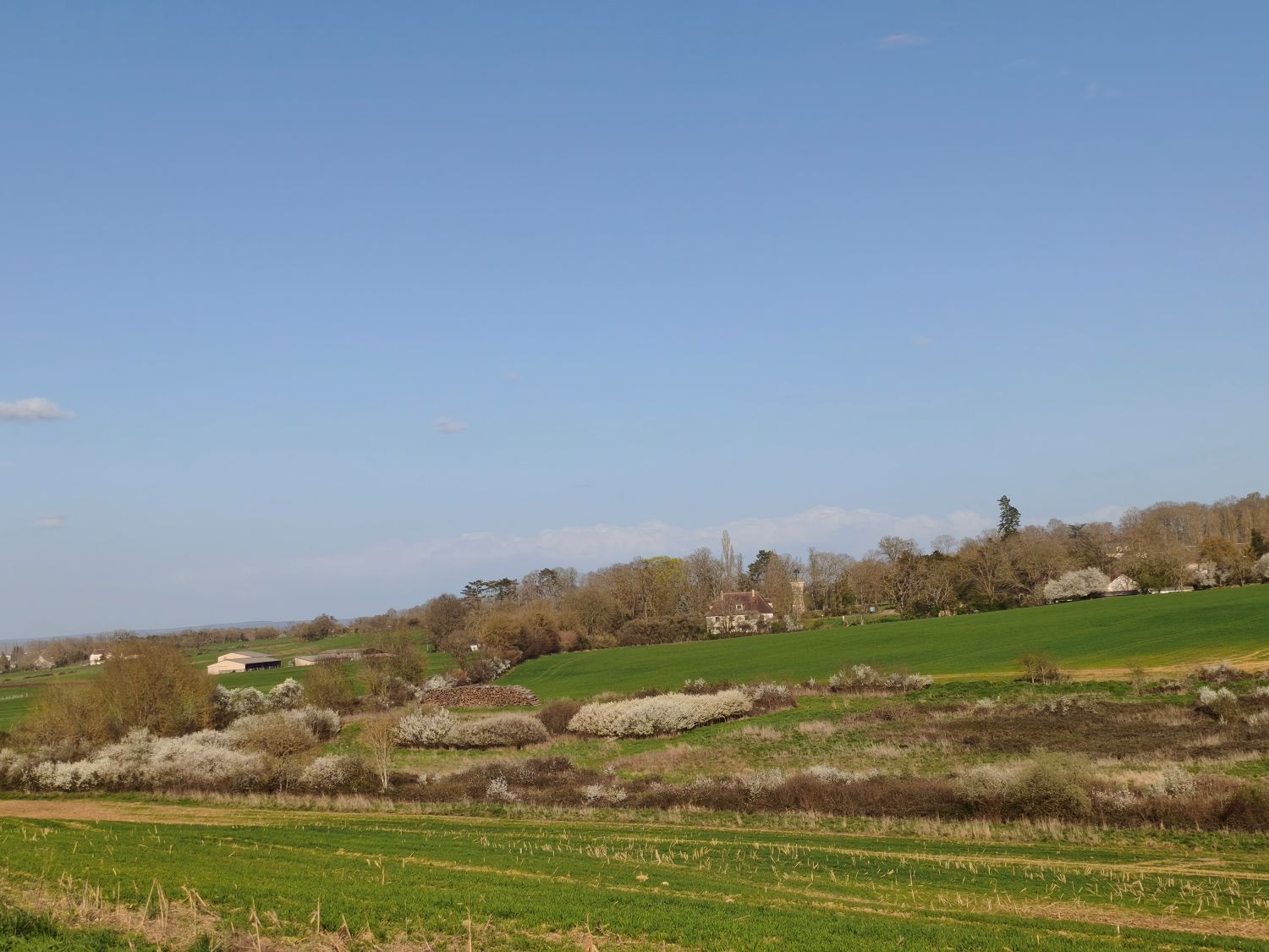 In den Gärten blühen die ersten Sträucher, die Hecken sind frisch gestutzt. Nur wenige Häuser scheinen bewohnt zu sein, und so begegne ich – trotz des Sonntags – kaum einem Menschen. Es ist wohl auch noch zu früh im Jahr, denn leider sind Anfang März weder das auf dem Hügel über dem Dorf thronende Schlösschen noch der Parc floral zugänglich. So genieße ich das Pausenbrot auf einer Bank am Fluss. Zurück geht es über leichte Hügel, vorbei an blühenden Hecken und kleinen Privatschlössern.