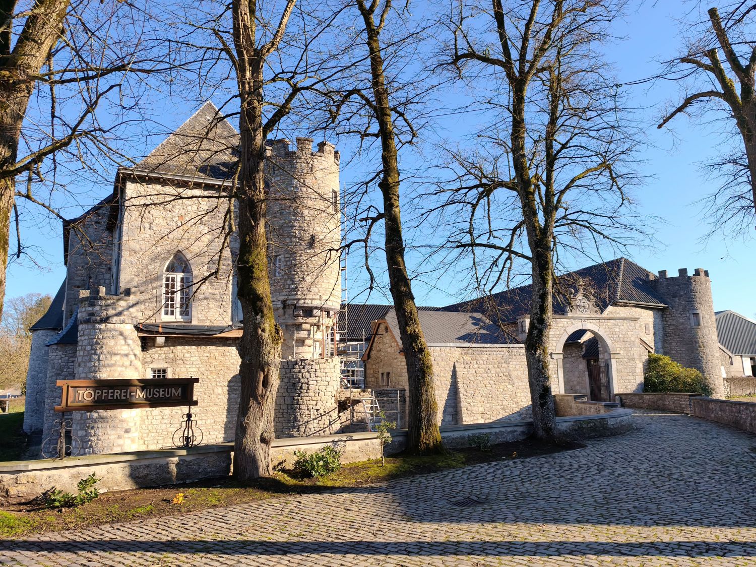 Da es noch früh am Nachmittag ist, kann ich die Umgebung erkunden und nach „Altbekanntem Ausschau halten“. Ein Spaziergang führt um das Dorfgebiet herum über die mit vielfältigen Durchgängen abgesicherten Weiden zur Burg Raeren, einer befestigten Wohnanlage mit Wassergraben aus dem Mittelalter. Heute beherbergt die Anlage ein Töpfereimuseum. Nebenan steht das Haus Raeren, ein mittelalterlicher Wohnturm, der fast noch in ursprünglicher Form erhalten ist.
