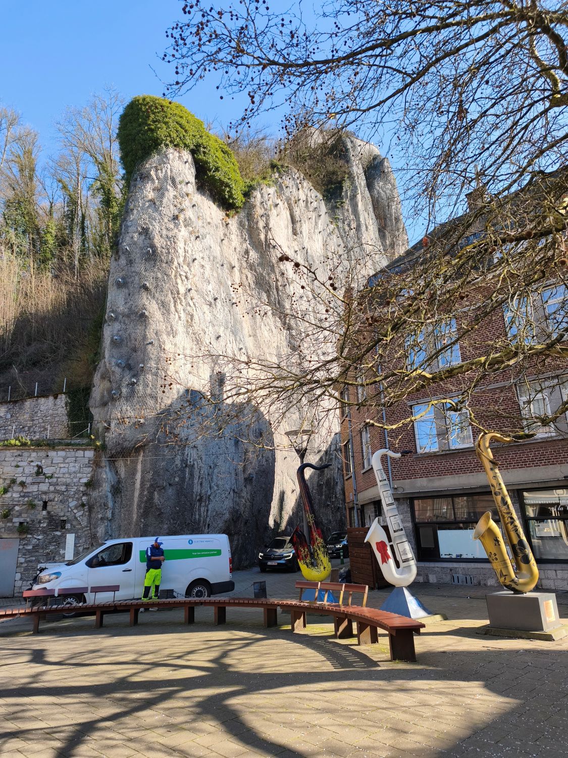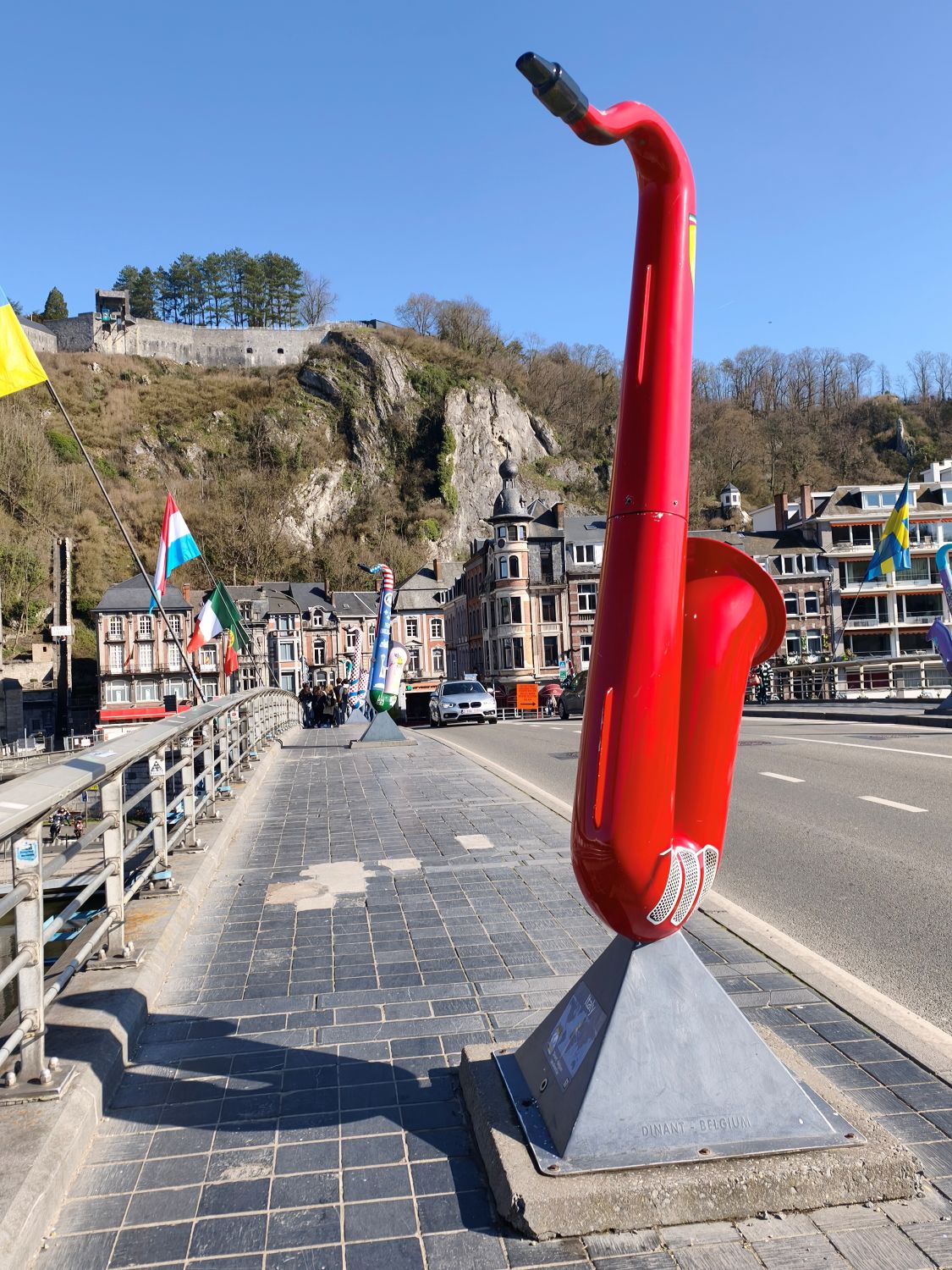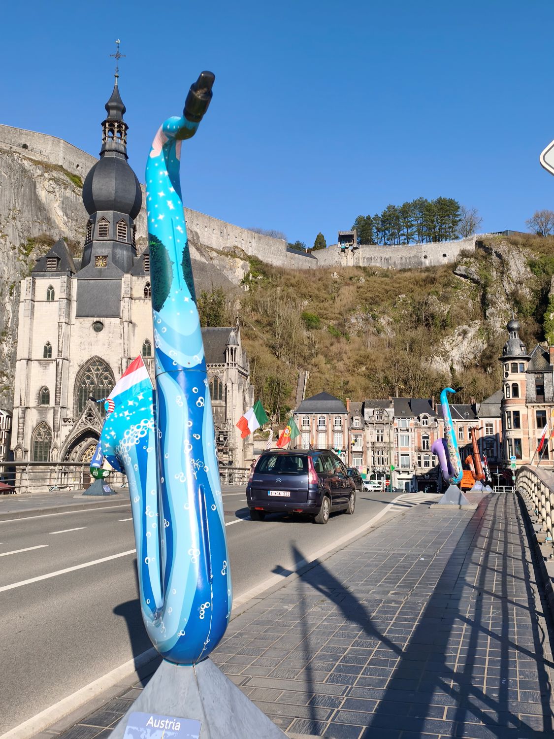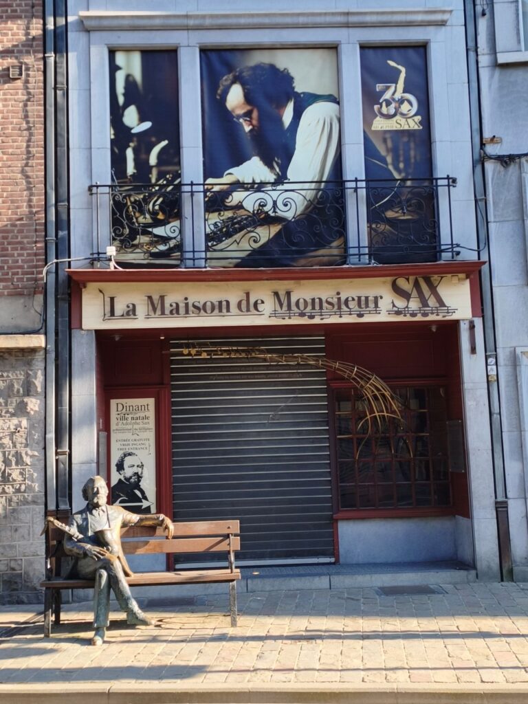 Nach 150 Kilometern Fahrt erreiche ich Dinant, eine Kleinstadt an der Maas in Wallonien. Sie ist unter Anderem bekannt als Geburtsort des Erfinders des Saxophons, Adolphe Sax. Das sehe ich auch auf jeden Schritt bei meinem ersten Stadtrundgang. Vom hundert Meter oberhalb des Stadtkerns gelegenen Parkplatz neben dem Sportzentrum geht es in steilen Kurven hinunter in die Stadt. Auf jedem Platz, an jeder Ecke stehen riesige Saxophone aus Holz, Plastik oder Gips, und die über die Maas gespannte Brücke ist auf beiden Seiten mit den farbig ausgestalteten Instrumenten geschmückt.