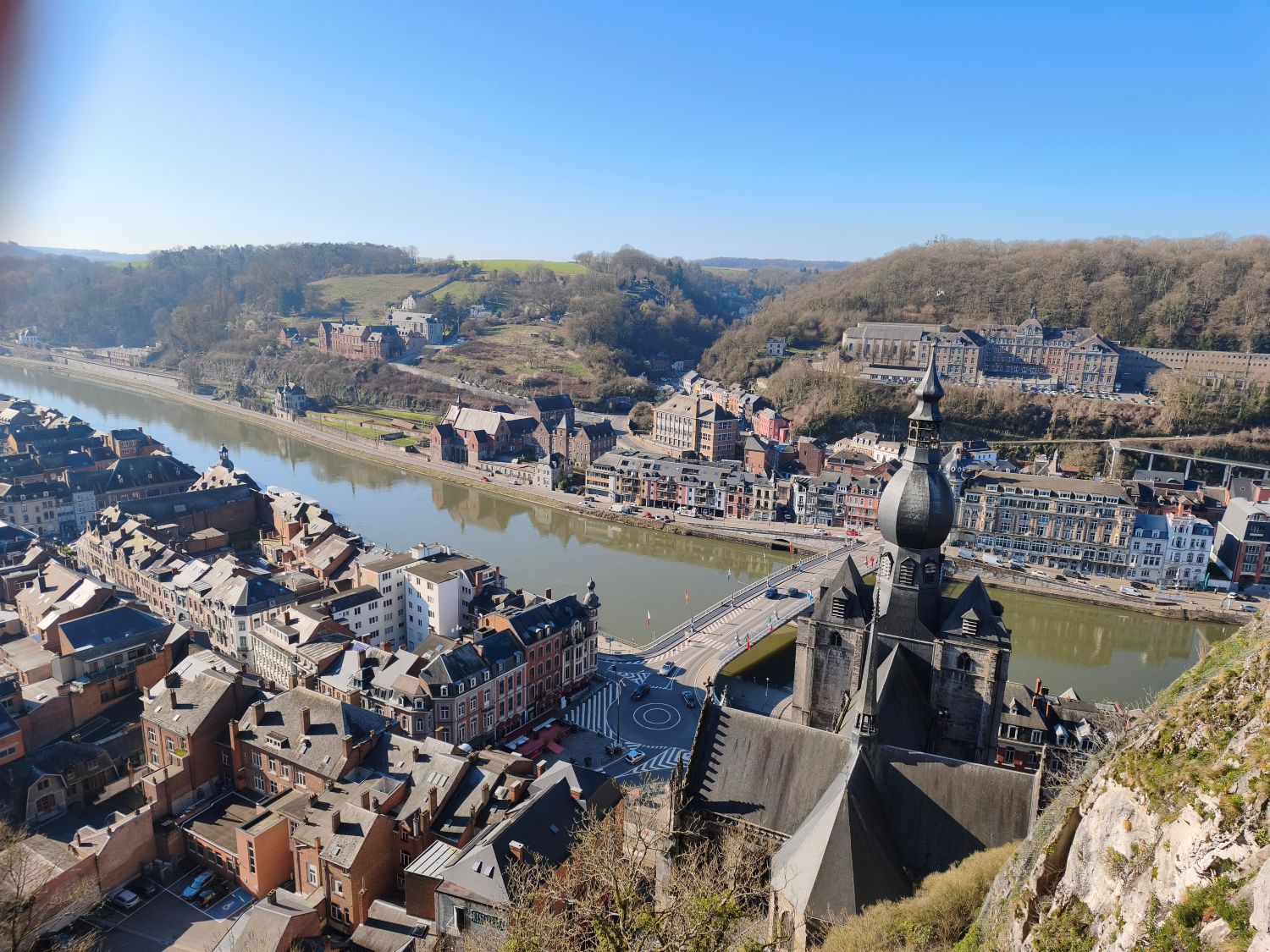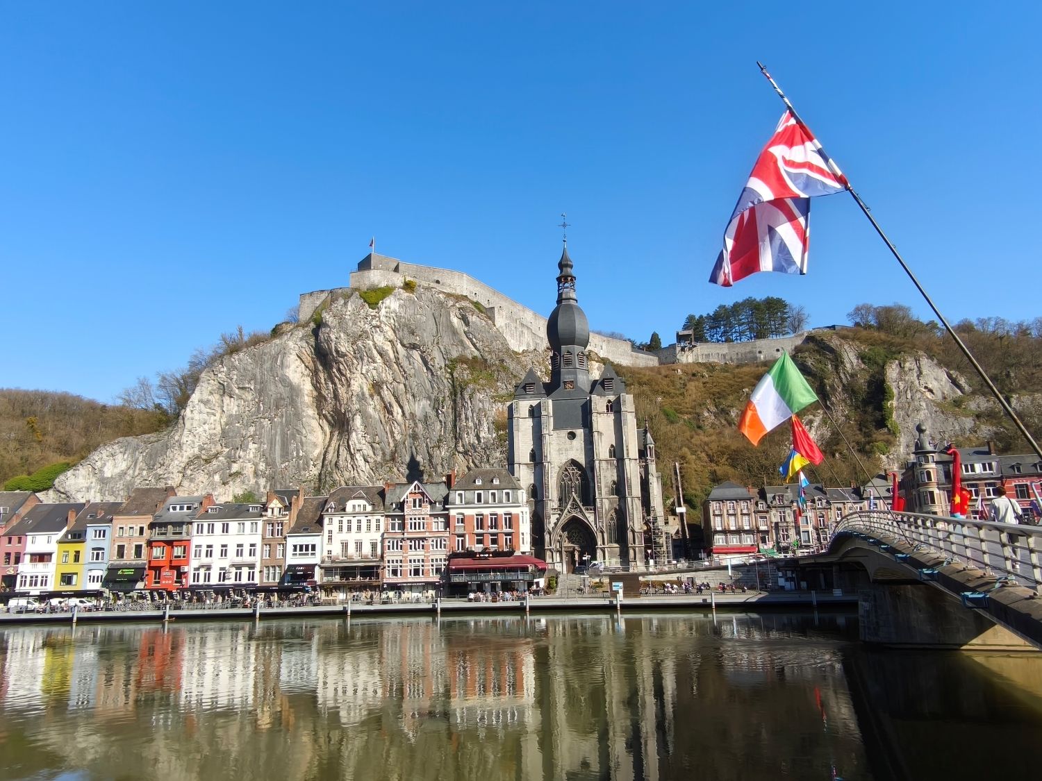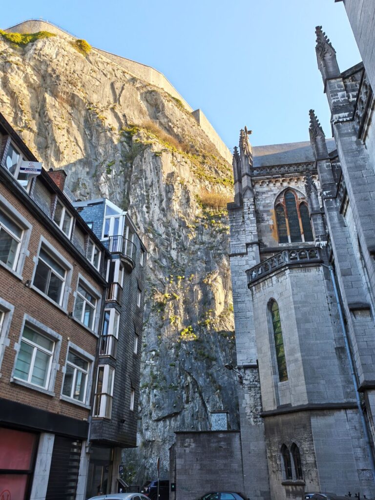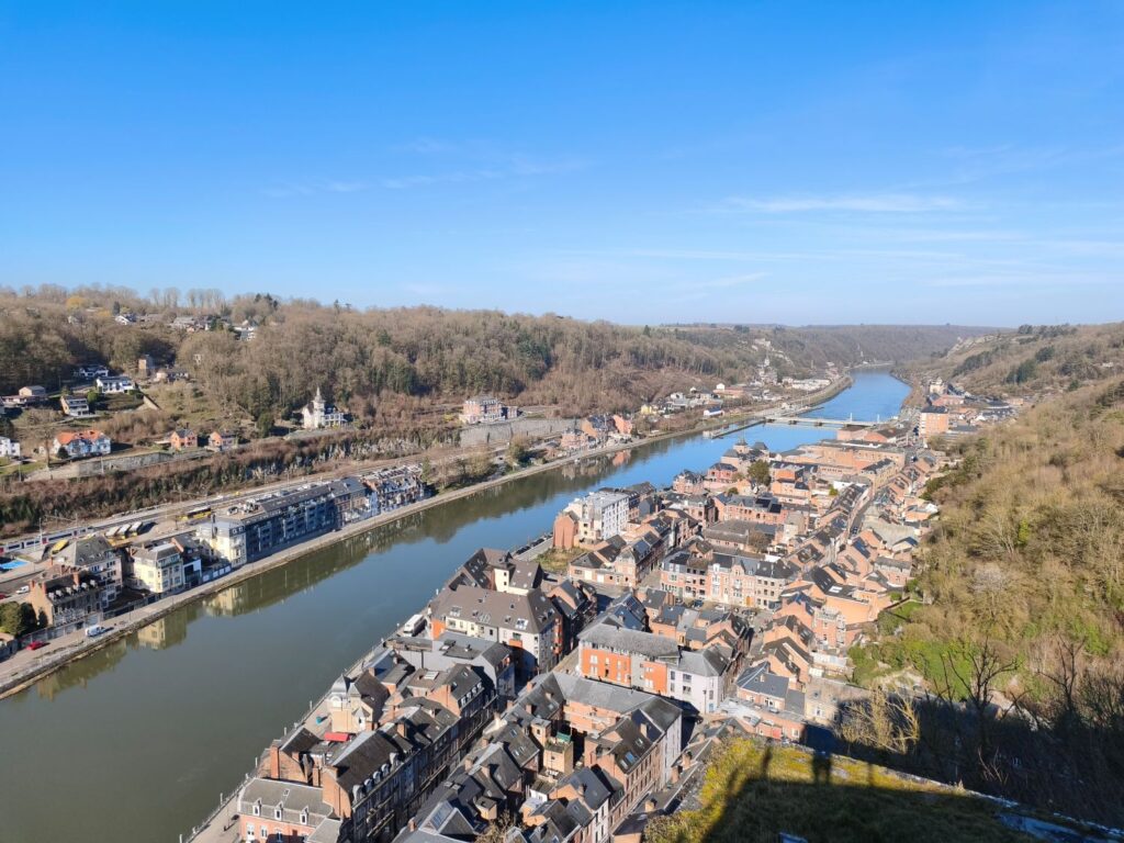 Nach 150 Kilometern Fahrt erreiche ich Dinant, eine Kleinstadt an der Maas in Wallonien. Sie ist unter Anderem bekannt als Geburtsort des Erfinders des Saxophons, Adolphe Sax. Das sehe ich auch auf jeden Schritt bei meinem ersten Stadtrundgang. Vom hundert Meter oberhalb des Stadtkerns gelegenen Parkplatz neben dem Sportzentrum geht es in steilen Kurven hinunter in die Stadt. Auf jedem Platz, an jeder Ecke stehen riesige Saxophone aus Holz, Plastik oder Gips, und die über die Maas gespannte Brücke ist auf beiden Seiten mit den farbig ausgestalteten Instrumenten geschmückt.