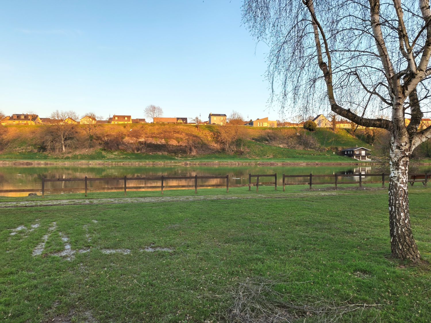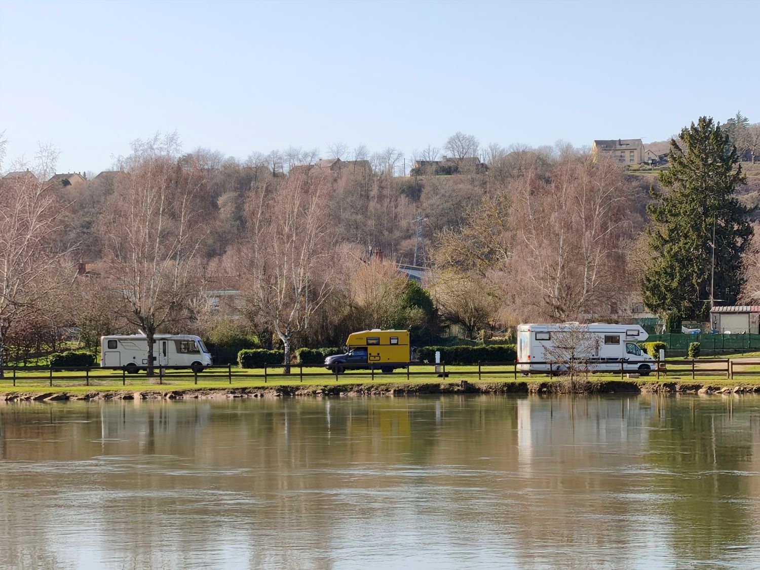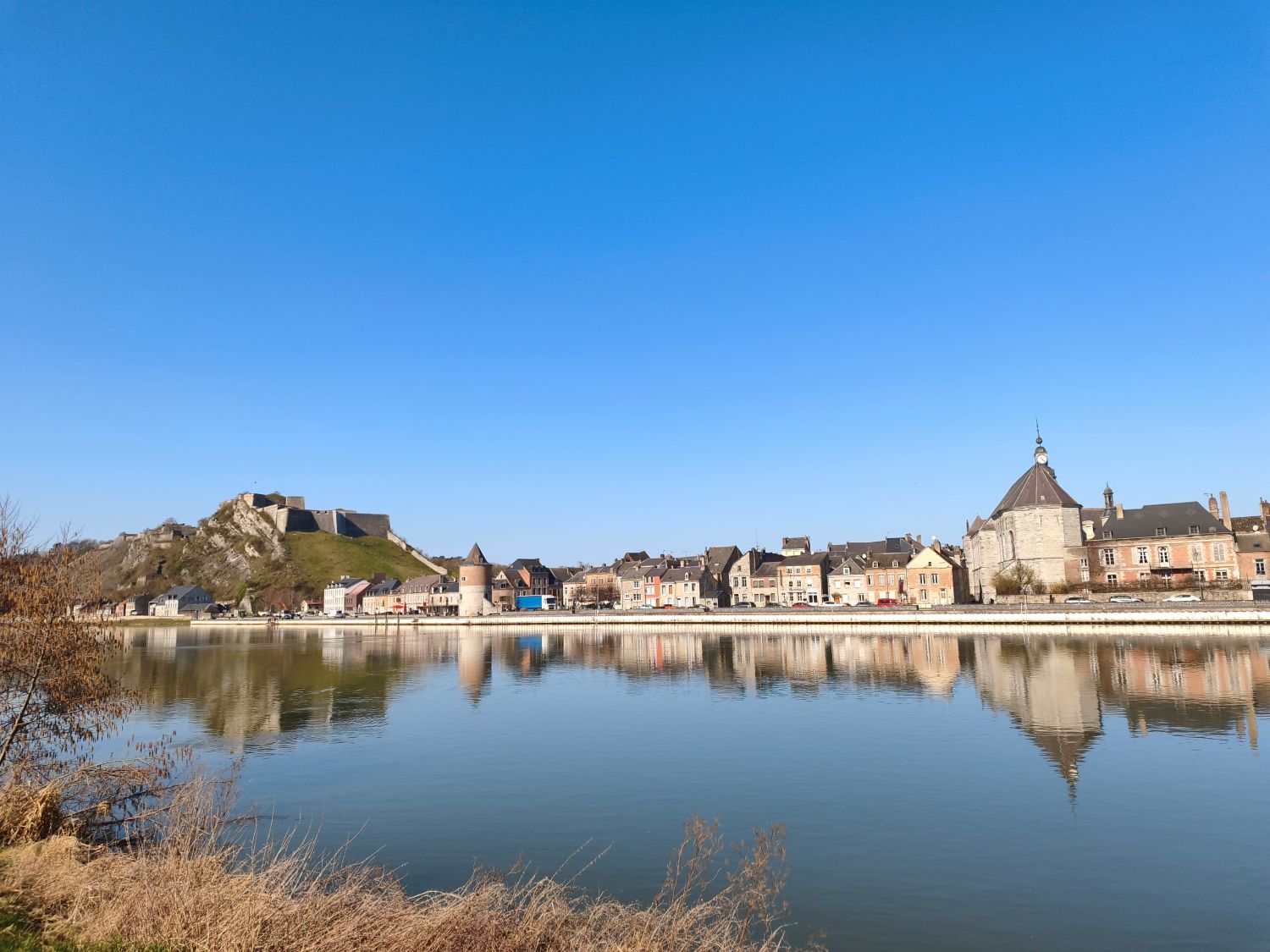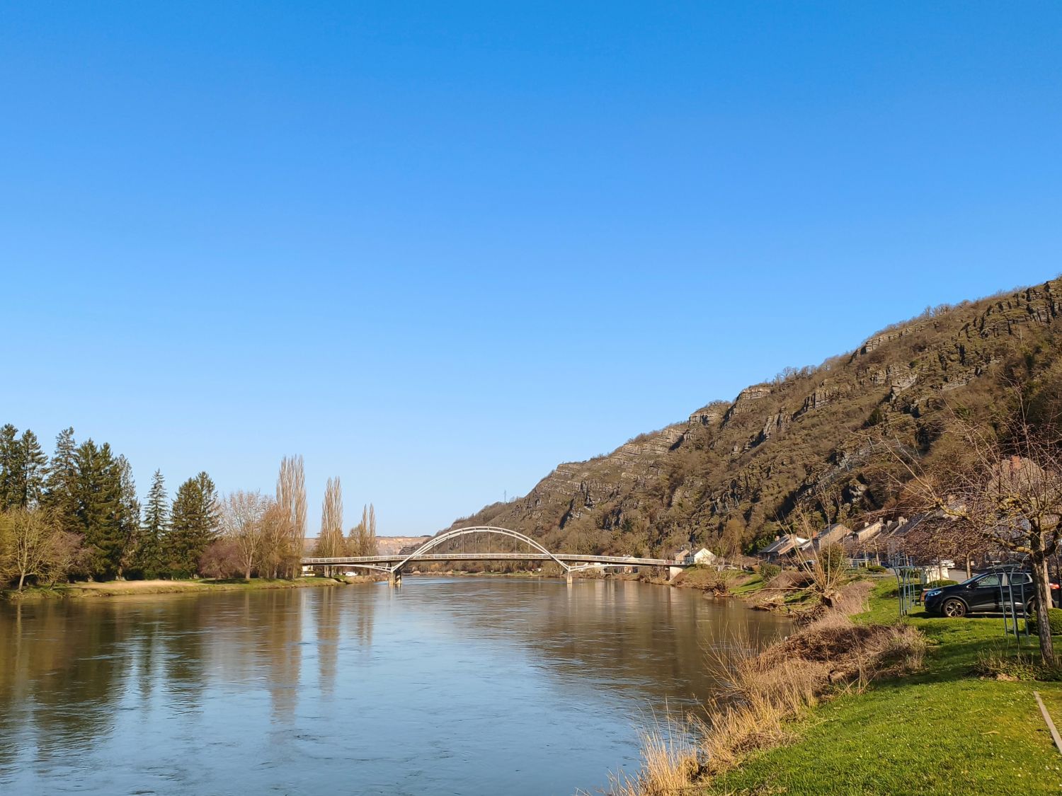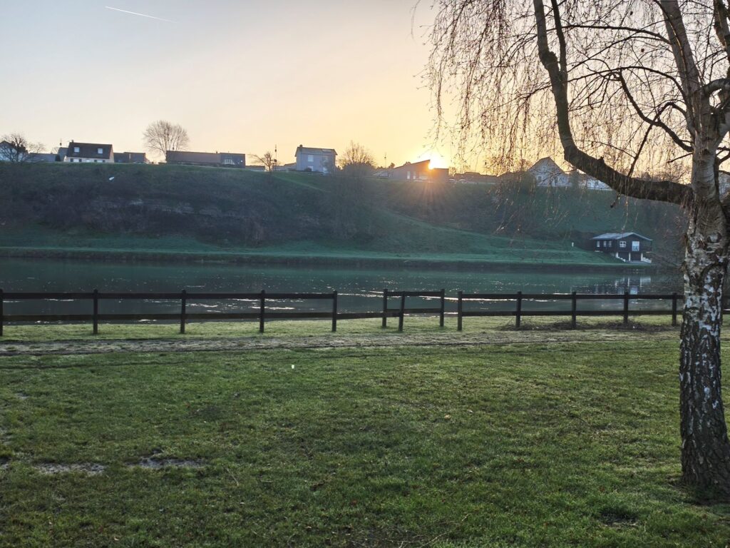 Nur gut 30 Kilometer weiter finde ich einen schönen Stellplatz im französischen Vireux-Molhain am Ufer der Maas. Der Platz war offenbar noch vor Kurzem überschwemmt, da die beiden Wohnmobile, die nach mir ankommen, auf der Wiese stecken bleiben, während ich Biene durch die Matsche dank des 4×4- Getriebes auf ein Stück festeren Untergrund bewegen kann. So kann ich einen schönen Blick zum Fluss hinüber genießen.