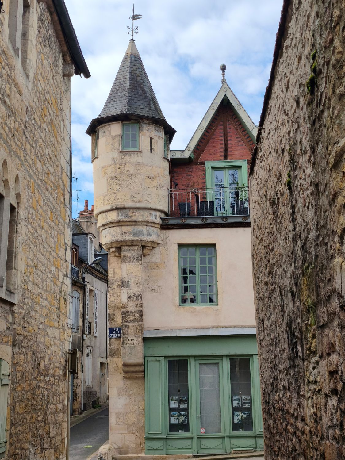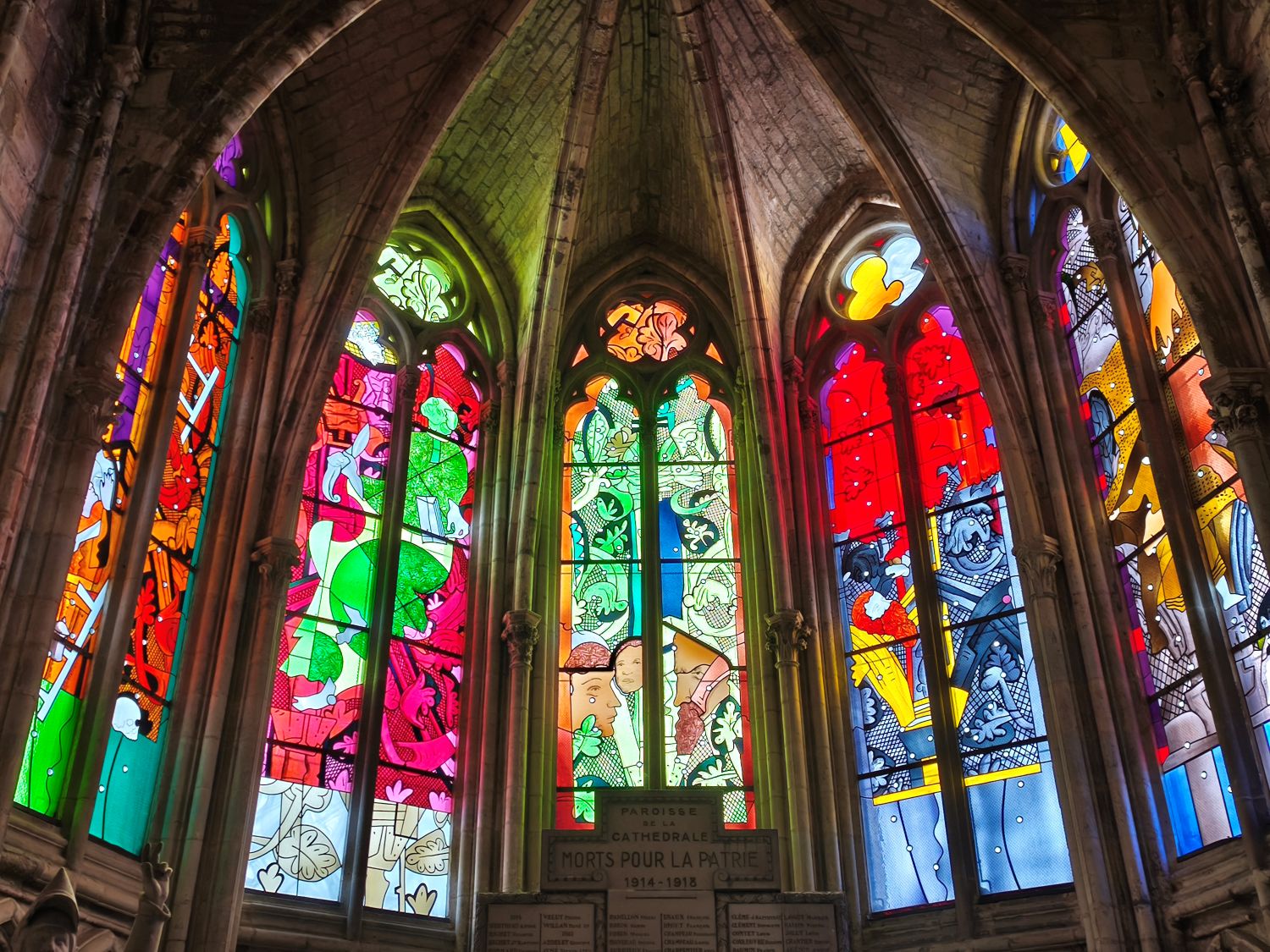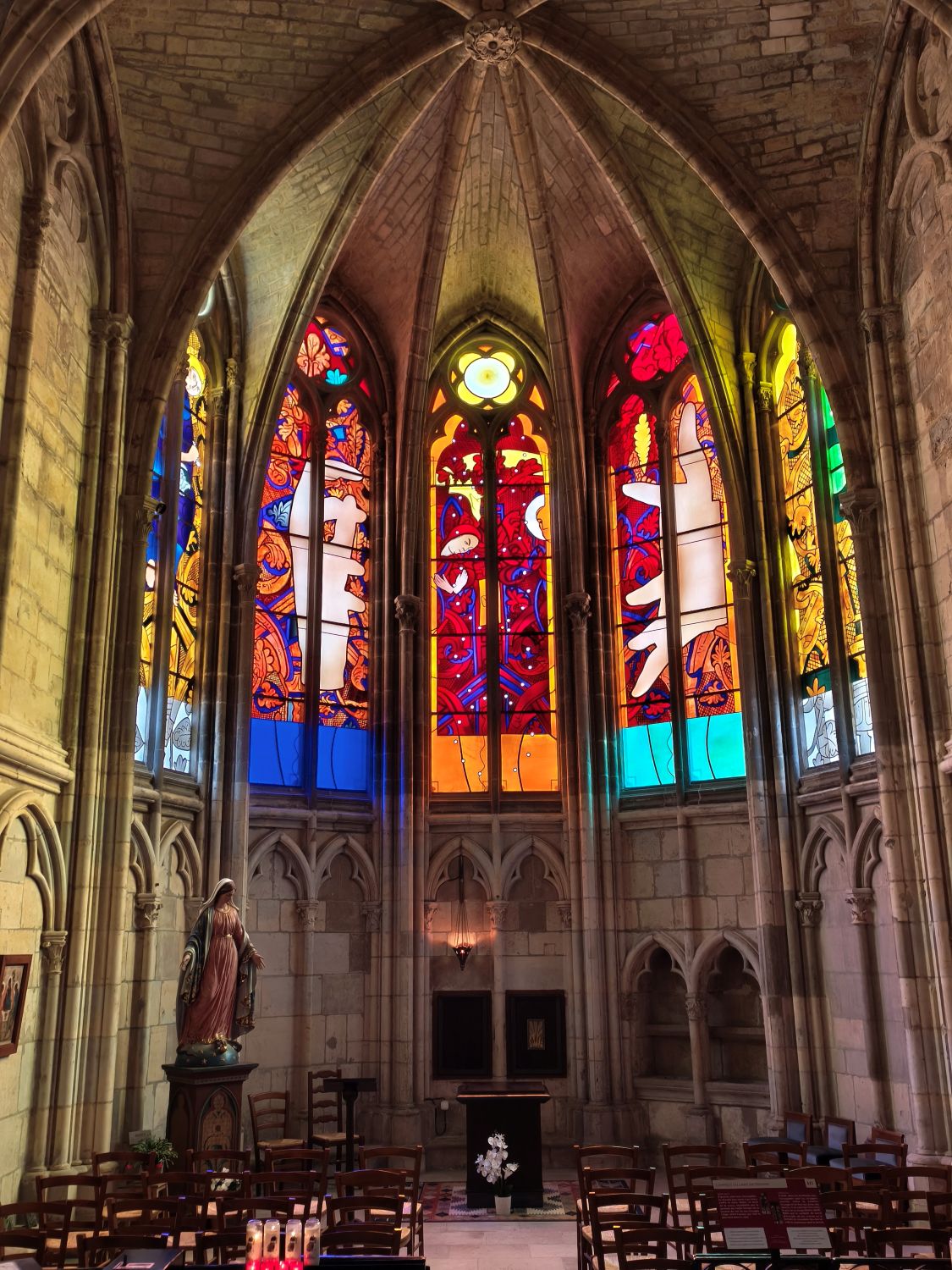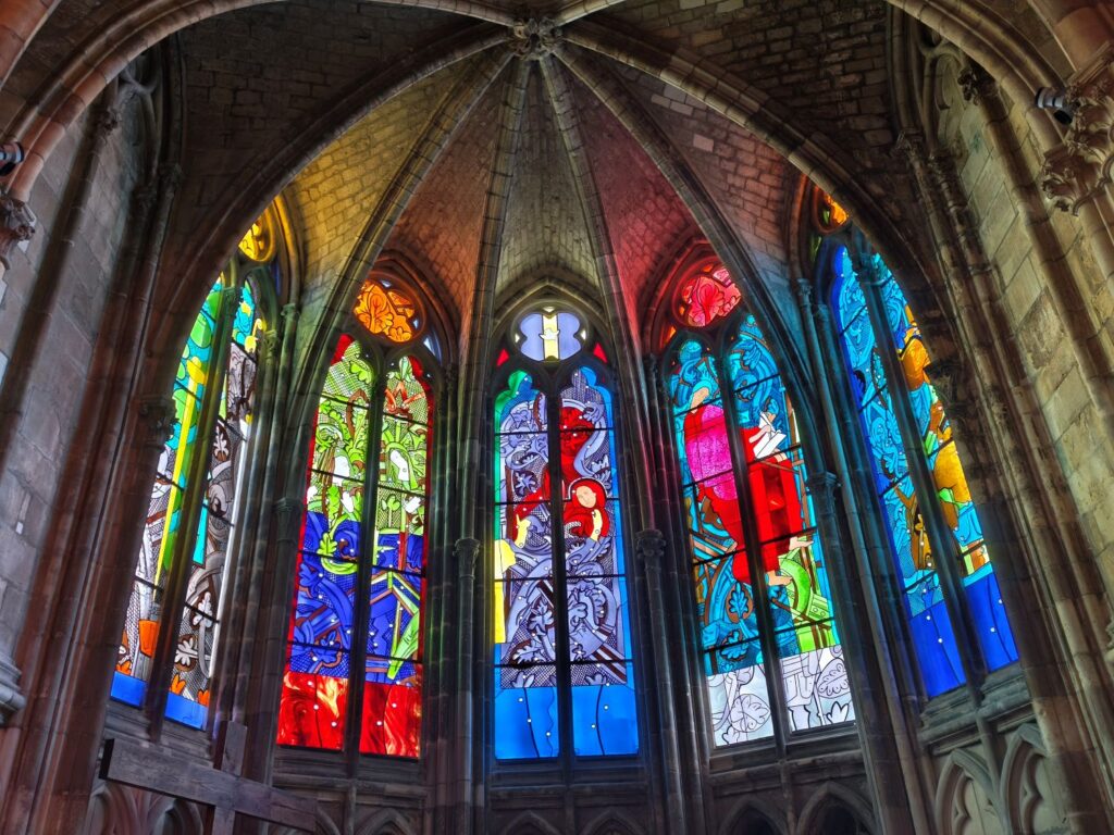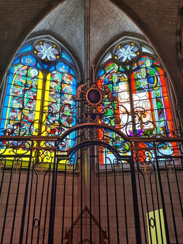 Da bleibt mir nichts anderes übrig, als die Monumentalbauten anzuschauen, durch die Gassen der Altstadt zu schlendern sowie einen Blick in die Kathedrale Saint-Cyr et Sainte-Julitte zu werfen. Diese wird zur Zeit renoviert und ist nur zu einem Drittel zugänglich – die bunten, in einem Farbenrausch erstrahlenden Fenster entschädigen das. Diese Fenster wurden nach der Zerstörung der Kathedrale im Juli 1944 und nach dem Wiederaufbau von verschiedenen Künstlern 1977-2011 gestaltet und sind sehr beeindruckend.